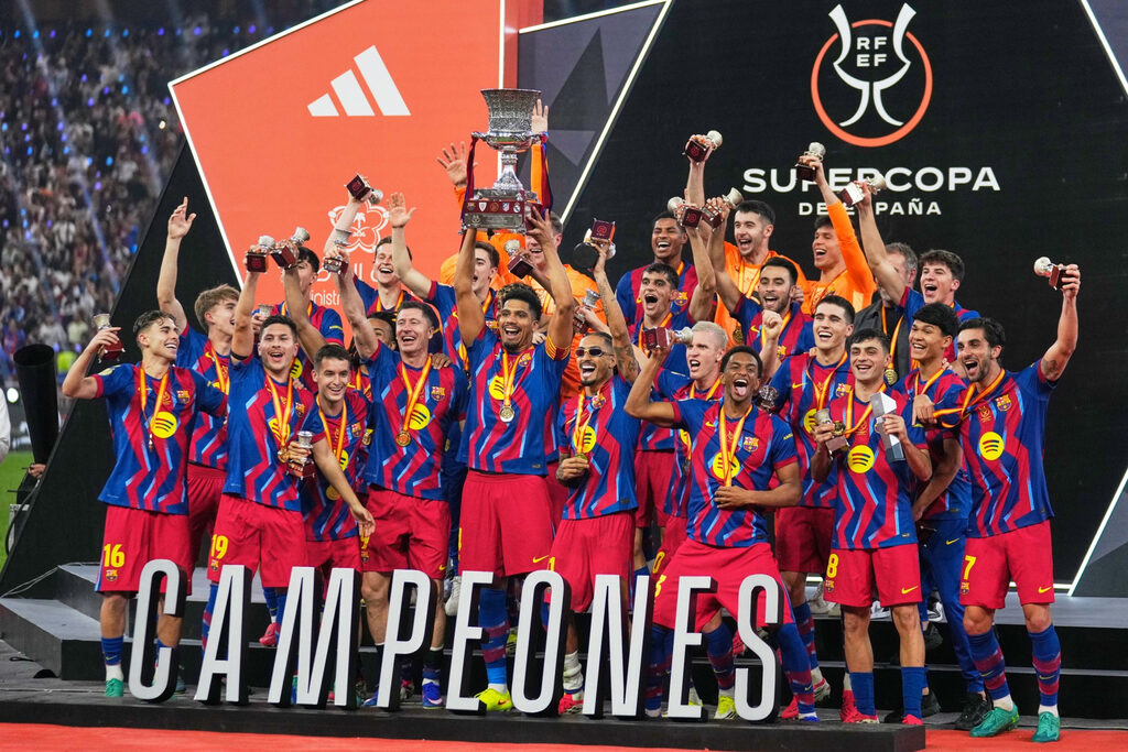 巴塞隆拿有也馬和利雲度夫斯基回到正選陣容;皇家馬德里則沿用了上場淘汰馬德里體育會的陣容,但歇冬後因傷缺席了兩場比賽的麥巴比,出現在後備名單中。兩軍上半場都創造了不少機會,但埋門一腳欠佳,巴塞方面有夏芬拿(Raphinha)和費明盧比斯錯失良機,近兩場取代麥巴比打正選的皇馬前鋒干沙路加西亞,也單刀失諸交臂。不過,踢至36分鐘,僵局打破,費明盧比斯在中場線妙傳給後上策應的夏芬拿,面對祖亞曼尼的防守,他冷靜推向其左邊後快速起腳,地波射破古圖奧斯的十指關。以為半場1:0作結,怎料補時竟出現3個入球,先是皇馬在補時兩分鐘由雲尼素斯在左路個人突破,連過兩關後窄角度施射得手,但兩分鐘後,柏迪送直線,利雲度夫斯基接應單刀挑過古圖奧斯,助巴塞再度領先;只是兩分鐘後,皇馬二度扳平,在角球攻勢中,先是侯辛迎頂,夏芬拿跳起救空門中柱彈出,但干沙路加西亞立即在門前補中,結果打成2:2回更衣室。下半場,兩隊依然鬥攻,但去到73分鐘,夏芬拿在禁區頂起腳,因為省中阿辛斯奧改變方向,讓古圖奧斯再度投降;皇馬落後下換入麥巴比,可是剛傷癒的他,在有限時間內也無法起到太大效用,唯一貢獻就是去到補時階段,博到法基迪莊踢中其小腿犯規,令對方紅牌被逐。10人應戰的巴塞最終依然以3:2險勝,報回今季聯賽首循環負1:2之仇,同時也連續兩年在西超盃決賽打敗對方,成功衛冕這項在沙特阿拉伯舉辦的賽事。分享 / Share :